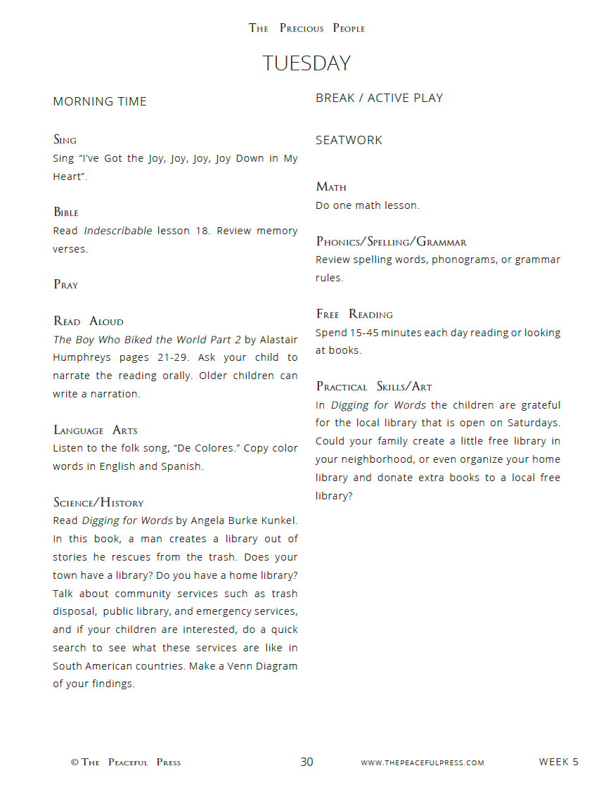 This is our 5th year doing peaceful press curriculum and are enjoying the new precious people! I especially like how we visit a new continent each month. It feels like the year flows smoothly and has been fun to watch my kids grow in their abilities to study and learn about different cultures even in two months! We have only done the first two months but so far the two main chapter read alouds left us wanting more depth. If I do this year again, I would choose heftier books to read through the month. I also think it would make much more sense to include the actual recipes within the curriculum instead of mentioning the recipe but having it in a separate PDF that you need to buy. Otherwise, we’ve enjoyed everything else!