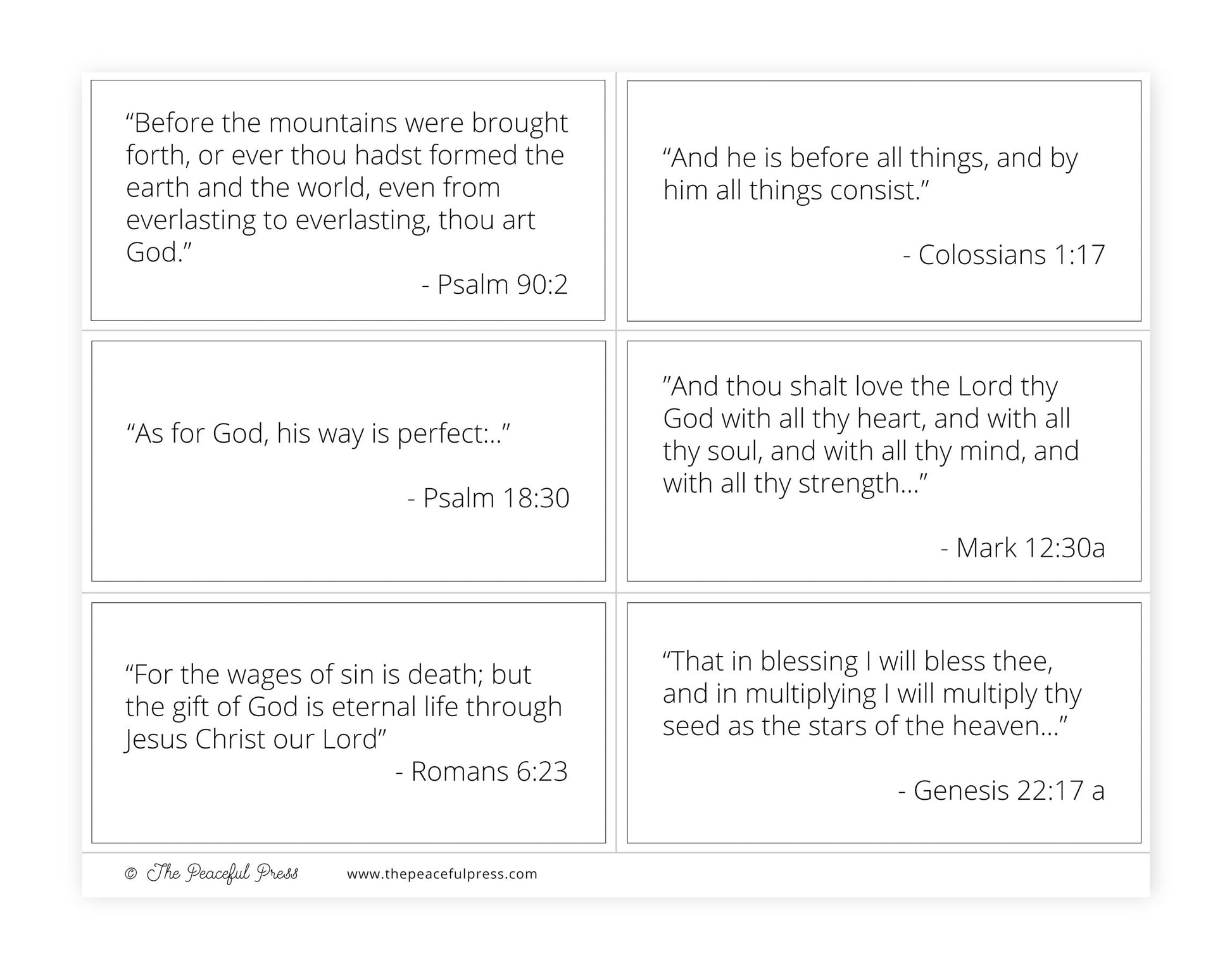 The Scripture Card set is a 5-page PDF digital download, with six bible verses on each page. You may print at home or at a local office supply store and laminate for durability.